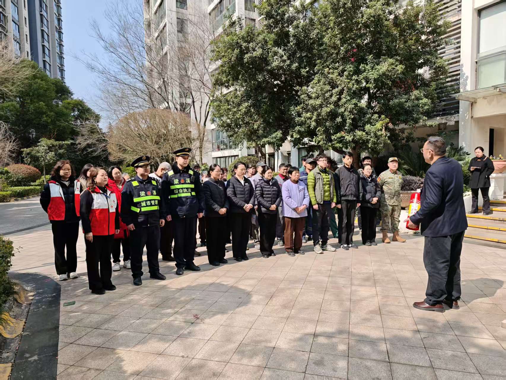 到达集结点后,城管队员首先现场示范灭火器“提、拔、握、压” 操作步骤,讲解初期火灾扑救与火场避险知识。然后结合小区治理,宣传楼道清障、电动车规范停放、安全用火用电等要求,把消防安全落到日常。